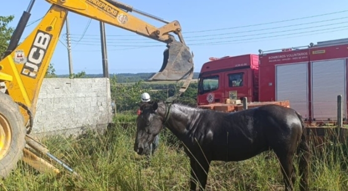 O lugar era de difícil acesso devido ao espaço - Foto: Divulgação Um cavalo precisou ser resgatado com ajuda de uma retroescavadeira após cair em uma fossa e ficar submerso.