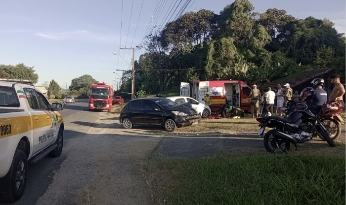 Três pessoas foram encaminhadas para hospitais da região - Foto: Divulgação Uma colisão entre dois carros mobilizou o Corpo de Bombeiros no fim da tarde do último sábado, 21 de março, na SC-370, na localidade de Pouso Alto, em Gravatal.