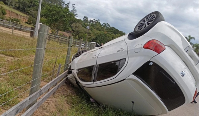 Vítimas não estavam no local quando chegaram os Bombeiros Voluntários - Foto: Divulgação Um veículo VW Gol capotou na tarde desta sexta-feira, 28 de março, no Bairro Costa da Lagoa, em Jaguaruna.