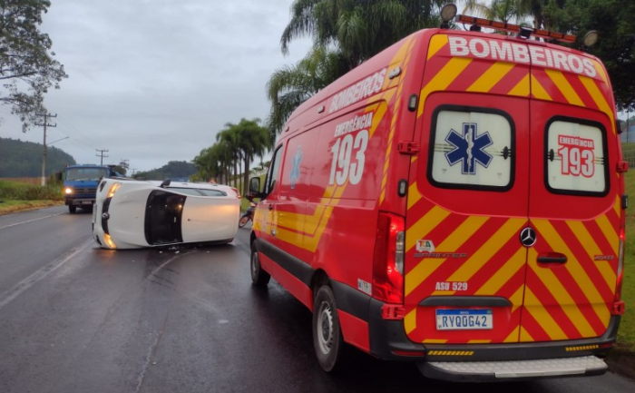 O condutor permaneceu no local junto à Polícia Militar Rodoviária - Foto: Divulgação Um automóvel capotou após colidir com um animal que havia caído de um caminhão na rodovia SC-108. O acidente envolveu um Renault Kwid e ocorreu quando o veículo atingiu um suíno que estava sobre a pista.