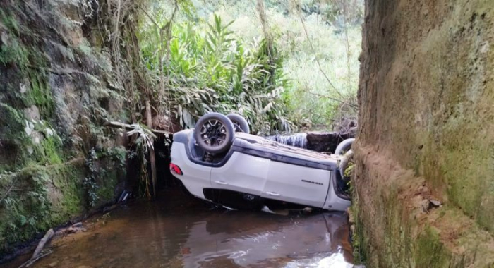 De acordo com as informações da ocorrência, o veículo — um Jeep Compass branco — despencou de uma altura aproximada de três metros. No automóvel estavam um homem de 58 anos e uma mulher de 54.