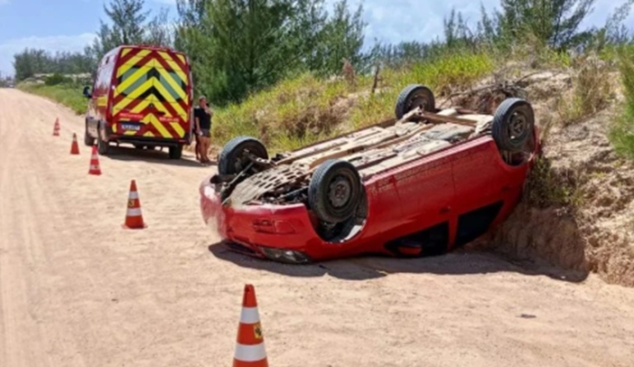 Os Bombeiros Voluntários de Jaguaruna foram até o local, mas a motorista recusou ser encaminhada ao hospital - Foto: Divulgação Um Chevrolet Celta, com placas de Braço do Norte, capotou após um acidente de trânsito registrado nesta sexta-feira, 27 de fevereiro, na Rua Urussanga, no Bairro Balneário Campos Verdes, em Jaguaruna.
