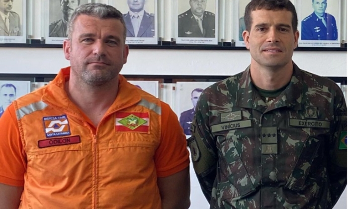 Coordenador da Defesa Civil de Capivari de Baixo, Odilon Joaquim apresentou demanda ao comandante da 14ª Companhia de Engenharia e Combate do Exército, capitão Vinícius Machado - Foto: Divulgação O coordenador da Defesa Civil de Capivari de Baixo Odilon Joaquim visitou na manhã desta terça-feira, 11 de fevereiro, o comandante da 14ª Companhia de Engenharia de Combate do Exército, em Tubarão, capitão Vinícius Machado.