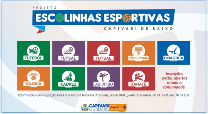 Confira documentos necessários para realizar a inscrição - Foto: Divulgação A Secretaria Municipal de Educação, Cultura, Esportes e Turismo de Capivari de Baixo, através do Departamento de Esportes, vai dar a largada nas atividades completas do projeto Escolinhas Esportivas, a partir da próxima semana, com novas modalidades.