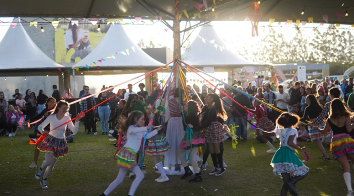 Os estudantes das escolas municipais apresentaram danças típicas como pau de fita - Foto: Divulgação Famílias de diferentes cidades da região participaram da Festa Junina no Parque 2025 no último domingo, 15 de junho,, no Parque Diamante +Energia, em Capivari de Baixo.