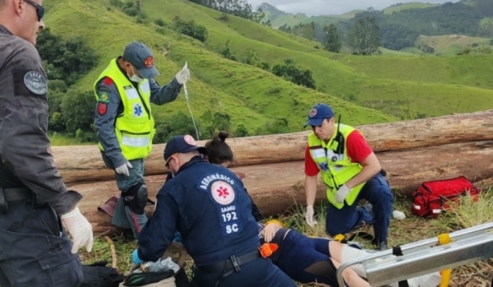 Gestante caiu sob madeiras após ser atingida por trator - Foto: Divulgação Uma gestante de cinco meses, de 32 anos de idade, precisou ser socorrida pelo serviço aeromédico após sobrer uma fratura exposta em Rio Fortuna. O acidente ocorreu na última segunda, 06 de janeiro.
