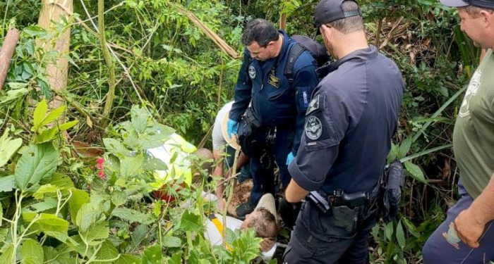 A aeronave da Polícia Civil, tripulada pelos policiais do Saer e pelos profissionais da saúde do Aeromédico Samu, foi acionada pelos bombeiros militares devido a dificuldade de acessar o homem que estava ferido em um terreno acidentado.
