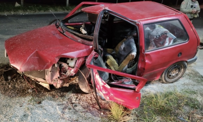 Fiat Uno ficou praticamente destruído - Fotos: PMRv/Divulgação Uma ultrapassagem mal calculada na noite do último sábado, 12 de julho, resultou na morte de um homem de 36 anos na SC-390, em Pedras Grandes.