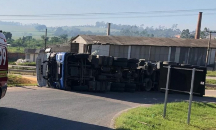 A carreta carregada com milho tombou na última quinta, 05