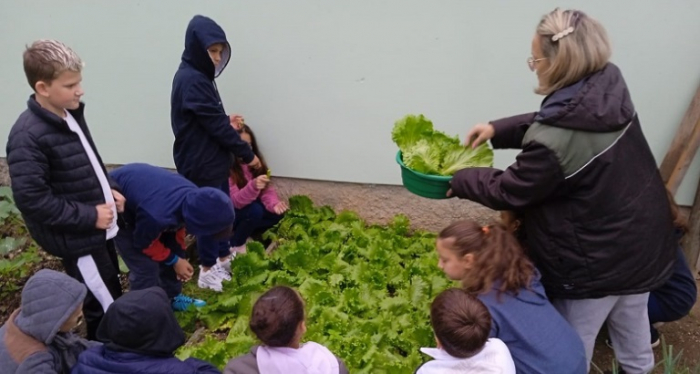 Estudantes de Gravatal colhem hortaliças que cultivaram Um mês após o primeiro plantio, a Horta Pedagógica feita pelos alunos da Escola Professora Naíde Guedert Teixeira, em Gravatal, começam a dar os primeiros alimentos. Nesta semana, os estudantes, acompanhados por professoras, puderam colher alface e temperos verdes que eles mesmos ajudaram a fazer o plantio.