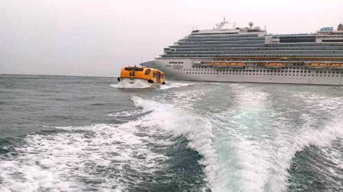 Em seguida o resgate 03 dos Bombeiros de Laguna acompanhou a embarcação proveniente do cruzeiro até o transatlântico, em segurança.