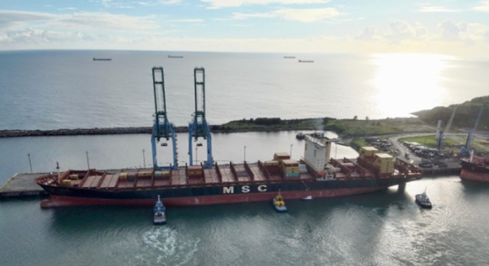 A embarcação integra a linha internacional que conecta a costa leste da América do Sul com a Ásia - Foto: Gabriel Escobar Com 346,98 metros de comprimento (LOA), o gigante MSC VILDA X marcou a história do Porto de Imbituba no último domingo, 12 de janeiro, com a maior embarcação já atendida pelo complexo portuário do sul catarinense.