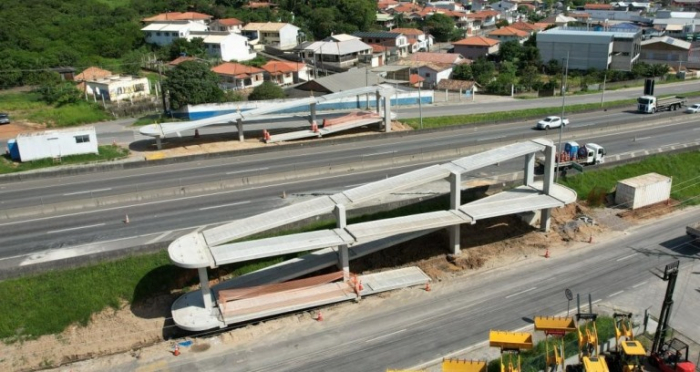 Novo elemento de infraestrutura rodoviária trará mais segurança - Foto: Divulgação A CCR ViaCosteira avança com as obras da passarela no km 328 sobre a BR-101, em Capivari de Baixo. A equipe técnica da Concessionária acompanha o andamento do projeto, que estava na fase de fundação e agora, com os pilares de sustentação erguidos, e as rampas implantadas segue em reta final para a última etapa estrutural com a execução do içamento das vigas.