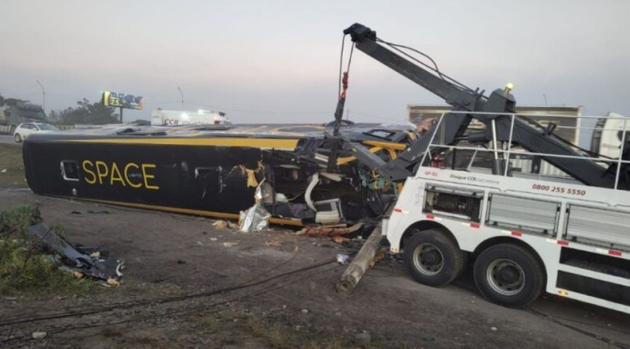33 pessoas estavam no veículo - Foto: Divulgação Um trágico acidente com um ônibus de turismo resultou em uma morte e um ferido grave na madrugada desta terça-feira, 22 de julho, entre Laguna e Imbituba.
