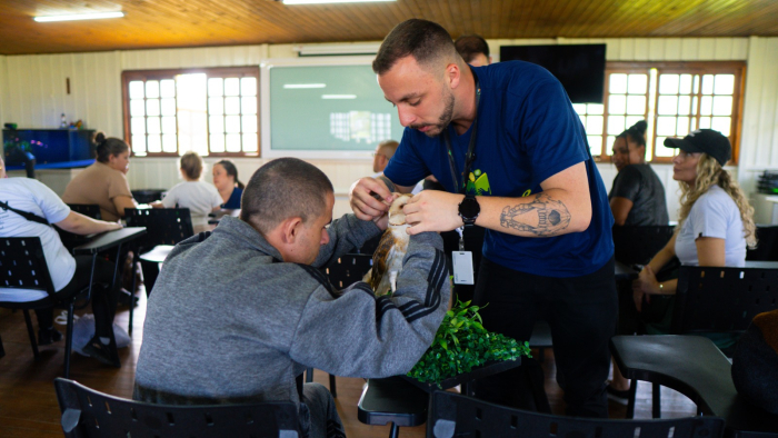 Os educadores guiaram as mãos de cada aluno sobre os animais - Foto: Divulgação Nesta semana, o programa proporcionou uma experiência especial e educativa aos alunos da Associação Tubaronense para Integração do Deficiente Visual (Atidev).