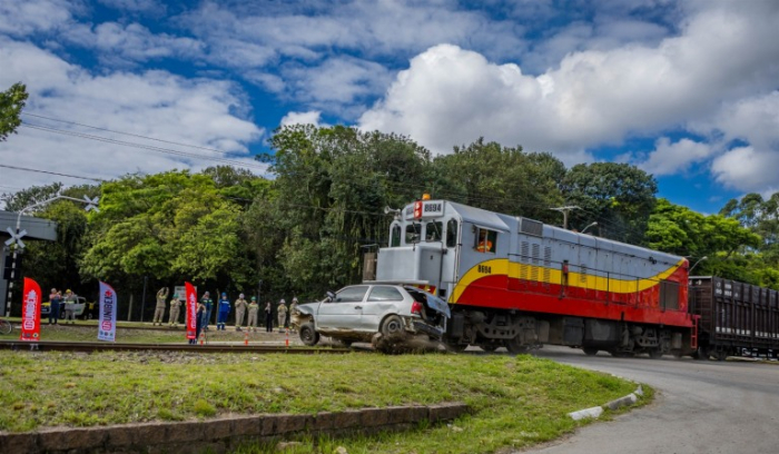 Segundo o Código de Trânsito Brasileiro, veículos sobre trilhos têm prioridade de passagem - Foto: Divulgação A Ferrovia Tereza Cristina (FTC) em parceria com outras entidades e as Forças de Segurança, realizou um grande simulado de acidente rodoferroviário na Passagem em Nível (PN) da Avenida Nilton Augusto Sachetti, no Bairro Santo André, em Capivari de Baixo.