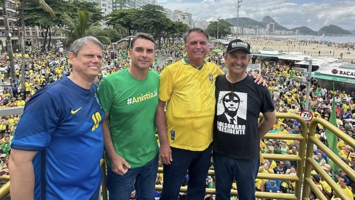 Governador de São Paulo, Tarcísio de Freitas, Flavio Bolsonaro, Jair Bolsonaro e Jorginho Mello - Foto: Redes Sociais O governador de Santa Catarina, Jorginho Mello (PL), participou no domingo, 16 de março, do ato “Anistia e Liberdade de Expressão”, em Copacabana, no Rio de Janeiro.