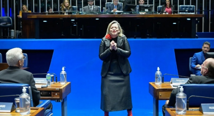 A contadora de histórias Nyedja Gennari fez apresentação "teatral" na manhã desta segunda-feira durante sessão no plenário do Senado - Foto: Geraldo Magela O presidente do Senado, Rodrigo Pacheco, assistiu com irritação, pela TV, à sessão de debates realizada na manhã desta segunda-feira no plenário da Casa, a pedido do senador Eduardo Girão (Novo-CE), destinada a discutir a resolução do Conselho Federal de Medicina que proibiu a assistolia fetal — procedimento usado na interrupção da gravidez nos casos de aborto previsto em lei — em casos deprobabilidade de sobrevida do nascituro.