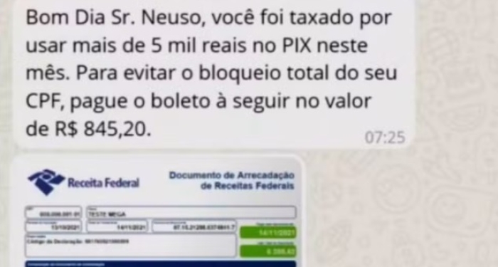 Criminosos estão abordando possíveis vítimas dizendo que há uma suposta cobrança de taxas pela Receita Federal sobre transações via Pix em valores acima de R$ 5 mil e, por isso, pedem que um boleto seja pago.