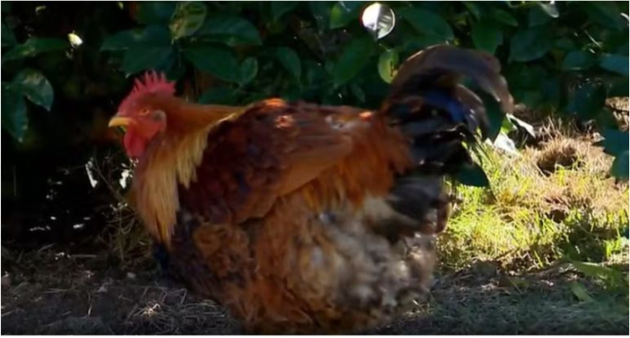 Ao longo de meses, a galinha, que era fêmea e botava ovos, começou a desenvolver características de galo, como penas alongadas, crista e esporão, e parou de pôr ovos.
