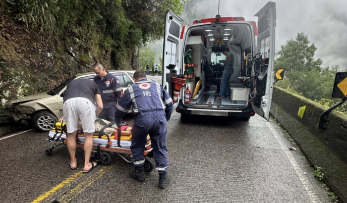 O incidente aconteceu por volta das 12h, no KM 405,3, em trecho de curva fechada e rampa acentuada. O condutor de um VW/Gol, de 46 anos, perdeu o controle do veículo devido à pista molhada pela chuva, colidindo frontalmente contra a encosta de pedras.