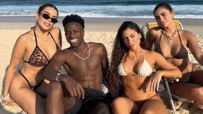 Imagem reacende a discussão sobre afetividade racial - Foto: Reprodução/Redes Sociais Após sua festa de 25 anos, Vini Jr. foi flagrado na praia do Rio de Janeiro com um grupo de amigas influenciadoras, todas brancas, como Catherine Bascoy, Dania Mendez e Maria Victoria Ruiz.