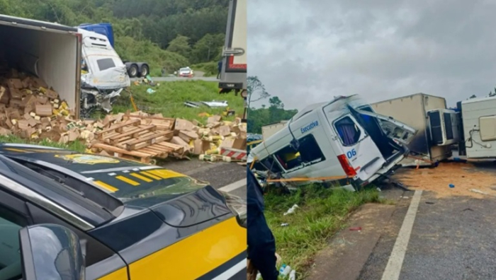 Além das mortes, duas pessoas ficaram gravemente feridas, duas tiveram ferimentos moderados e outras 12 sofreram feridas leves - Foto: Reprodução Seis pessoas morreram e 16 ficaram feridas, na madrugada desta segunda-feira, 05 de janeiro, após o tombamento de uma carreta sobre uma van de passageiros, na BR-116, em Campina Grande do Sul, na Região Metropolitana de Curitiba (PR).
