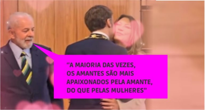 Imediatamente, diversos memes foram publicados nas redes sociais feitos a partir de imagens da recente visita do presidente da França, Emmanuel Macron, quando ele distribui afagos em Janja - bem diante e sob os olhares de Lula.