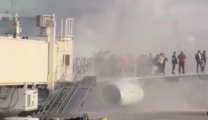 Imagens compartilhadas em redes sociais mostram passageiros aglomerados em uma das asas da aeronave aguardando resgate. É possível ver que ela estava estacionada no terminal, indicando que havia uma operação de embarque ou desembarque ocorrendo.