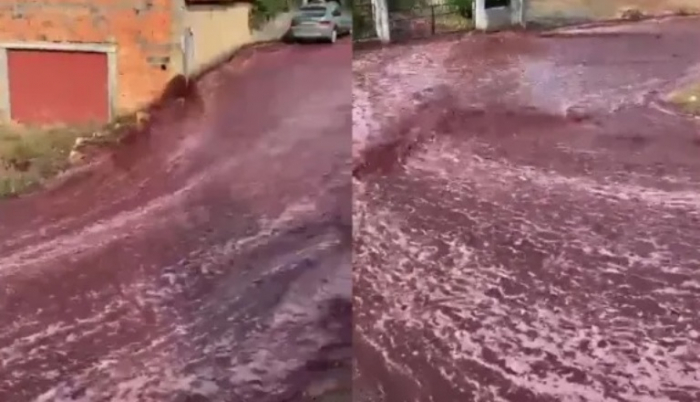 Imagens compartilhadas nas redes sociais mostram as ruas alagadas pelo vinho, que chegou a formar correnteza em alguns lugares.