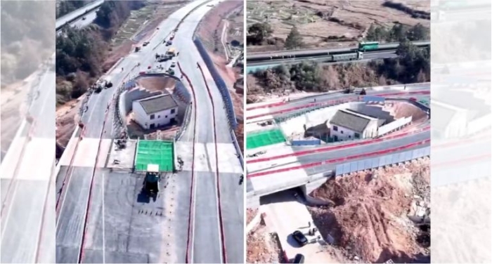 Uma cerca separa o imóvel da construção - Foto: X Um idoso e proprietário de uma casa em Jinxi, na China, recusou-se a vender sua casa para a construção de uma nova rodovia no local e acabou se arrependendo da decisão.