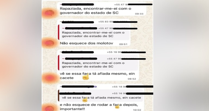 Conversa já está em posse das autoridades policiais - Foto: Reprodução Após a morte do influenciador de direita americano Charlie Kirk, mensagens com ameaças ao governador de Santa Catarina, Jorginho Mello, passaram a circular em grupos de WhatsApp.