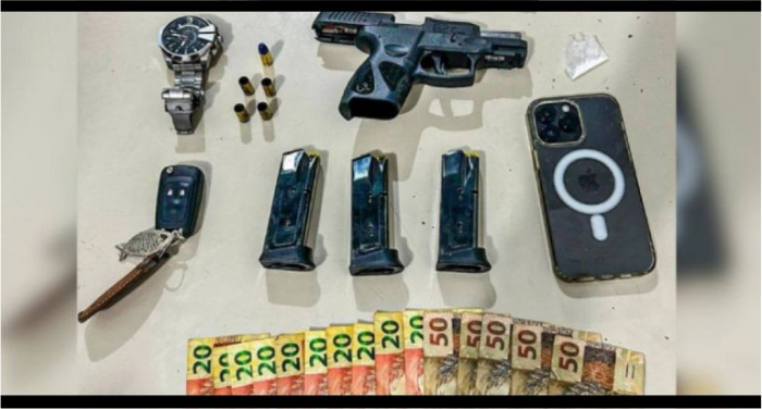 Ele foi preso após ser constatado o porte de uma pistola (calibre 9mm), além de carregadores sobressalentes, dinheiro e cocaína no interior de seu veículo. O infrator foi conduzido até a Delegacia de Polícia Civil.