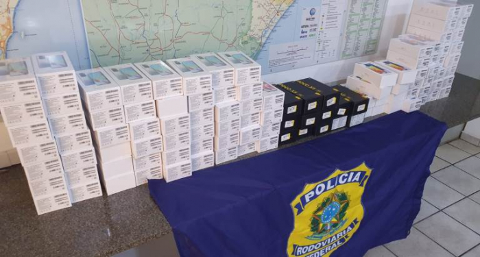 Ele e o passageiro responderão pelo crime de descaminho - Foto: Divulgação Na tarde desta segunda-feira, 15 de janeiro, policiais rodoviários federais apreenderam 105 smartphones importados do Paraguai em Biguaçu, na BR-101.
