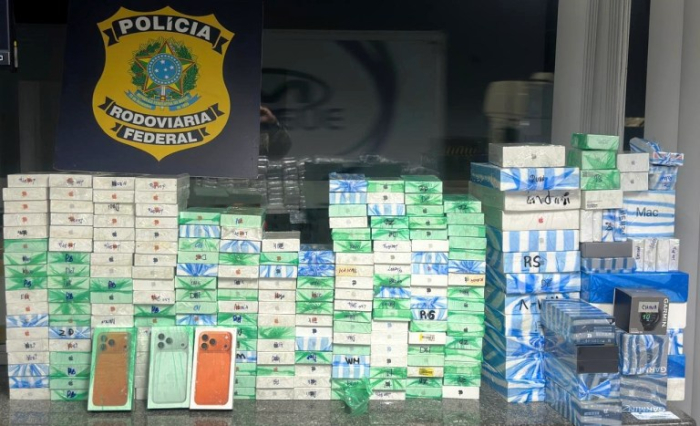 Durante a vistoria no interior do veículo, a equipe encontrou diversas mochilas carregadas com aparelhos de alto valor comercial, a maioria da marca Apple e sem embalagens originais. Ao todo, foram contabilizados 789 telefones celulares — incluindo modelos recentes como o iPhone 17 Pro Max — além de 86 itens de informática e fotografia, como MacBooks, iPads, relógios inteligentes e lentes profissionais.