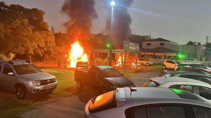 Dois veículos foram totalmente consumidos pelas chamas - Foto: Divulgação Um homem provocou um incêndio na última terça-feira, 22 de outubro, em uma revenda de carros em Rio Fortuna. A Polícia Militar e o Corpo de bombeiros foram acionados aproximadamente às 5h20.