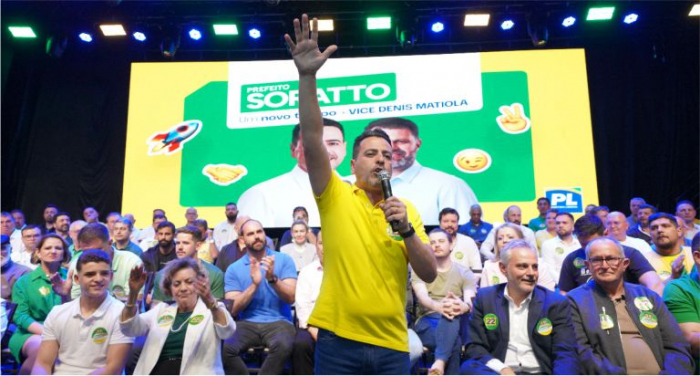 Comunidade e líderes políticos participaram do evento - Foto: Divulgação - Vídeo: Fabiano Bordignon/Revista Única A chapa de candidatos a prefeito e vice de Tubarão, Soratto (PL) e Denis (PSD), foi lançada às 19h22, na Hangar 737, na noite da última quinta-feira, 29 de agosto. Autoridades políticas como o governador Jorginho Mello, o filho do ex-presidente Bolsonaro, Eduardo Bolsonaro, o senador Beto Martins e deputados estaduais e federais, além de representantes da comunidade participaram do encontro.