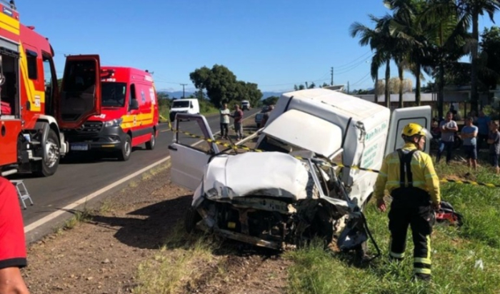 A vítima que conduzia uma Fiorino ficou presa entre as ferragens, foi resgatoda e encaminhada ao hospital, mas não resistiu.
