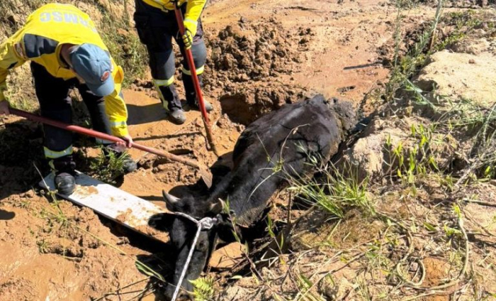 Ao chegar ao local, por volta das 14h55, os bombeiros constataram que o animal estava completamente preso no interior da vala, sem conseguir se movimentar. Para realizar o resgate com segurança, a equipe iniciou a retirada de material arenoso ao redor do bovino, utilizando ferramentas manuais, e montou um sistema de salvamento com tripé e redução de força. O animal também foi tracionado com o auxílio do caminhão ABTR-72.