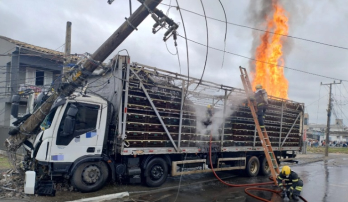 A cabine do veículo foi preservada - Foto: Divulgação Um caminhão Iveco Tector colidiu em um poste de energia e causou um incêndio por volta do meio-dia e meia desta quarta-feira, 18 de junho, na Avenida Universitária, no bairro Santa Luzia, em Criciúma.