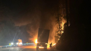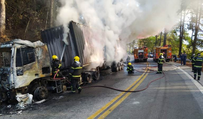 Apesar do impacto, o acidente provocou apenas danos materiais - Foto: Divulgação O Km 51 da BR-282, em Águas Mornas, na Grande Florianópolis, está bloqueado na manhã desta quarta-feira, 09 de julho, em ambos os sentidos após um caminhão pegar fogo.
