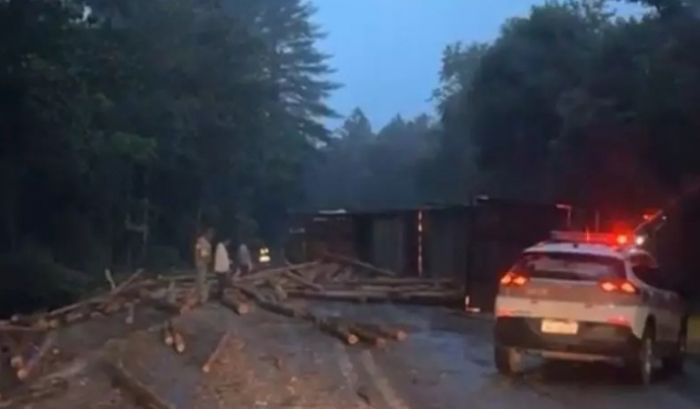 Caminhão com toras de madeira tomba e bloqueia trecho da BR-282, em Alfredo Wagner – Foto: Reprodução Uma carreta, carregada com toras de madeira, tombou na BR-282, em Águas Mornas, na Grande Florianópolis. As duas pistas da rodovia estão bloqueadas neste início de quinta-feira, 08 de agosto.