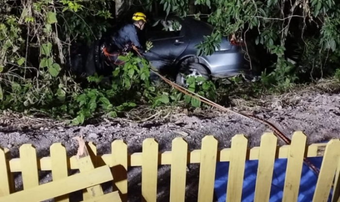 O veículo ficou preso em árvores. O Corpo de Bombeiros Militar e o Samu foram acionados para atuar na ocorrência.