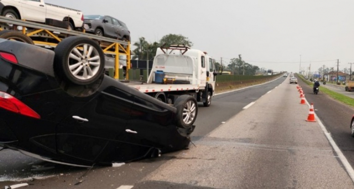 Não há informações sobre a causa do acidente. - Foto: Divulgação Um motorista de 36 anos levou um grande susto no início da tarde desta terça-feira, 10 de setembro. Ele conduzia um Hyundai/X35, com placas de Criciúma, que capotou no km 399 da BR-101 sentido sul em Maracajá.