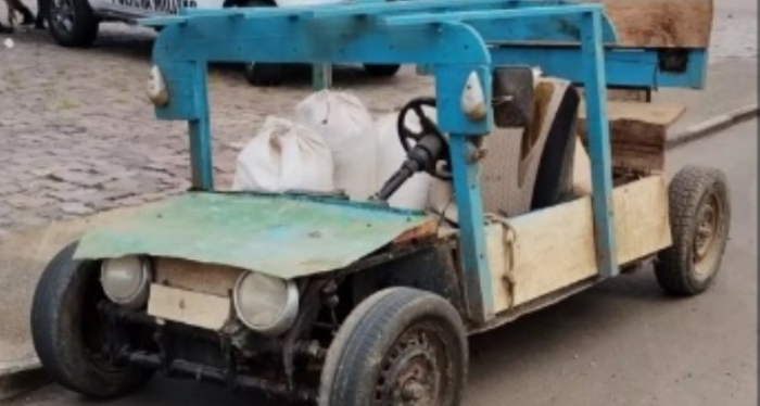 Motorista foi orientado a utilizar seu veículo apenas em sua propriedade rural - Foto: Reprodução Um carro completamente artesanal foi abordado pela Polícia Militar Rodoviária nesta sexta-feira, 1º março, na SC-390, em Celso Ramos, na Região Sul de Santa Catarina.