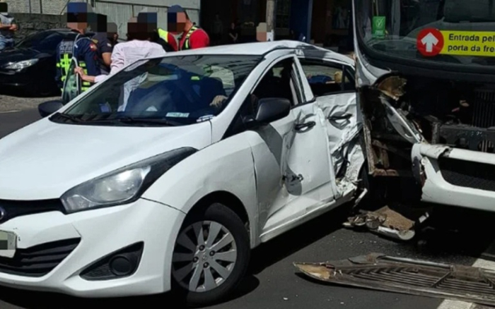 Com o impacto, o veículo de passeio foi arrastado por alguns metros - Foto: Reprodução Uma mulher grávida ficou ferida após um acidente entre um ônibus e um carro em Criciúma.