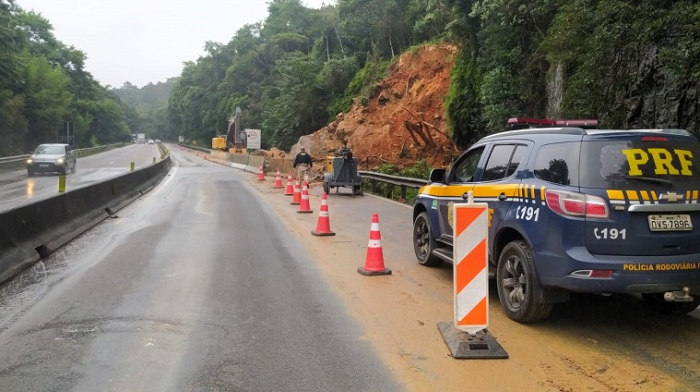 Trabalhos seguem no local e são monitorados por PRF - Foto: Divulgação Na manhã desta quarta-feira, 17 de abril, a chuva parou na região da Grande Florianópois às 9h onde os trabalhos para recuperação do km 233 no Morro dos Cavalos seguem após o deslizamento e afundamento na pista provocados pelas chuvas.
