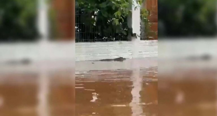 Jacaré em ruas de Porto Alegre após enchente - Foto: Reprodução Na tarde de terça-feira, 07 de maio, algumas pessoas relataram terem visto um jacaré pelas ruas alagadas do Bairro Menino Deus, em Porto Alegre. No vídeo divulgado, é possível ver o animal nadando perto de muros.