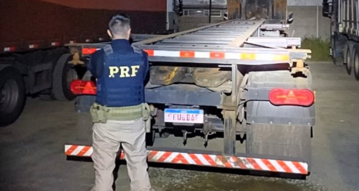 O semirreboque já estava clonado, com placas falsas e adesivos cobrindo a marcação do chassi original, com o objetivo de tentar enganar a fiscalização.