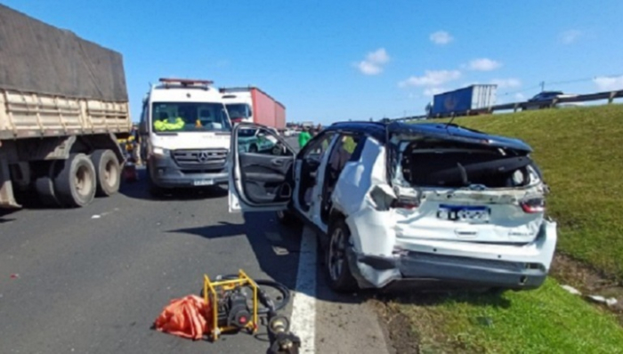 A colisão envolveu cinco veículos, sendo dois caminhões e três carros, informou a Polícia Rodoviária Federal (PRF). Entre as vítimas, estava o motorista de um Jeep Compass, de 34 anos, que teve ferimentos graves. As outras três vítimas ficaram levemente feridas.